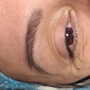 In this type of look shading is created with PMU machine with the control very clean intense out line and darker at tail and fading towards front of the brow very modern look.